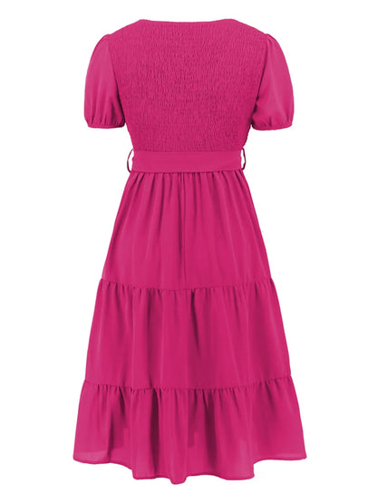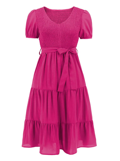 This charming dress features a smocked bodice and a flattering tied waist, creating a perfect fit that highlights your silhouette. Its tiered skirt adds playful volume and movement, making it ideal for sunny days or casual outings.
